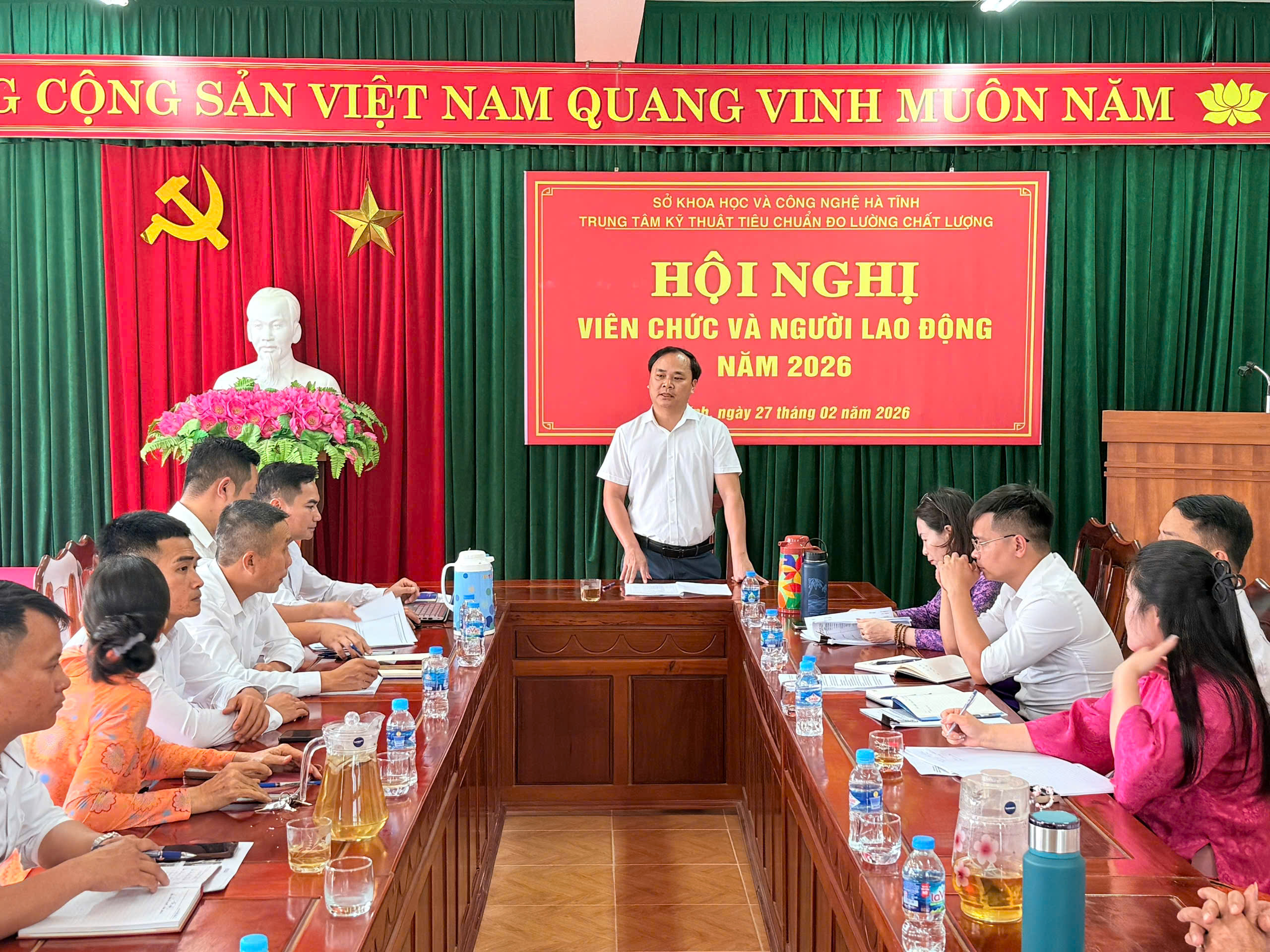 Chiều ngày 27/02/2026, Thực hiện kế hoạch năm 2026, được sự thống nhất của Ban Lãnh đạo, Trung tâm Kỹ thuật Tiêu chuẩn Đo lường Chất lượng Hà Tĩnh đã long trọng tổ chức Hội nghị Cán bộ, Viên chức, Người lao động năm 2026 nhằm đánh giá kết quả thực hiện nhiệm vụ năm 2025 và đề ra phương hướng, nhiệm vụ cho năm 2026.